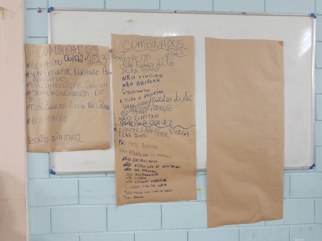Rodas de conversa e atualização da lista dos combinados acontecem todo dia, com assuntos livres que trazem e os que surgem durante as atividades.