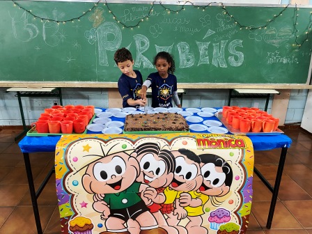 Homenageamos os aniversariantes nos seus dias de aniversário e, no último dia do mês, degustamos um saboroso bolo.