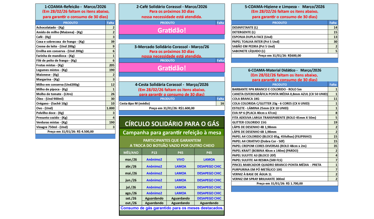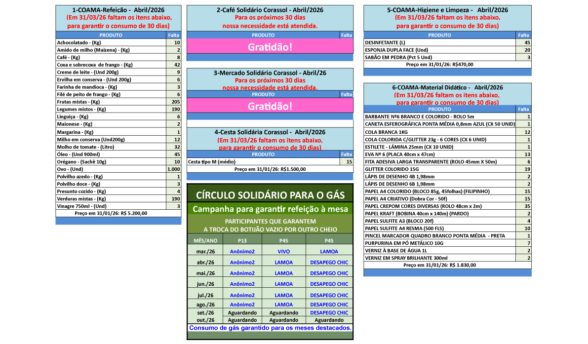 Agradecidos, atualizamos os dados sobre a Campanha Solidária de Produtos, para os próximos 30 dias.