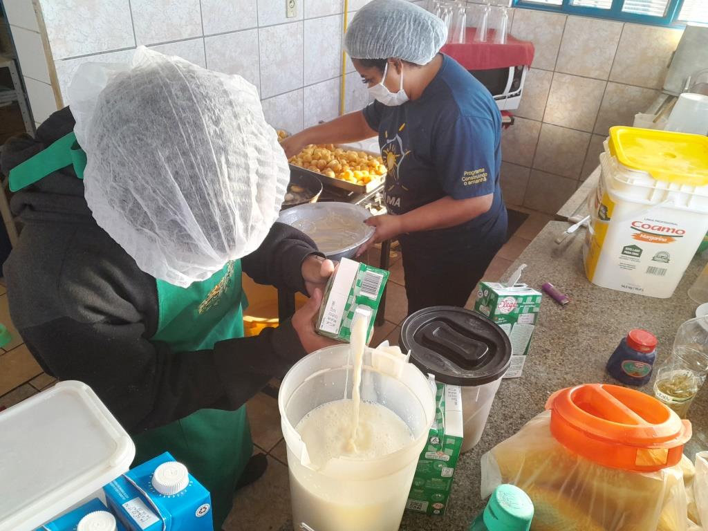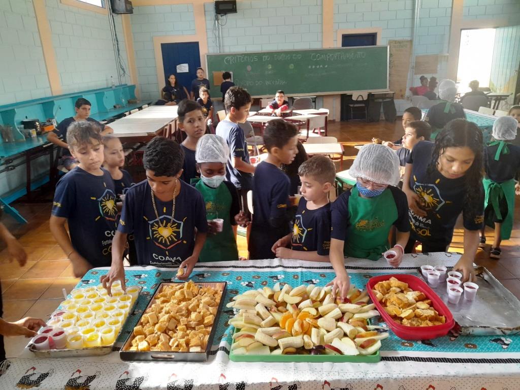 E não foi só ele a estrela do dia não, também cortamos frutas para fazer parte do nosso lanche e um delicioso Bolo de Pão de Queijo, que não sobrou nadinha para contar história!